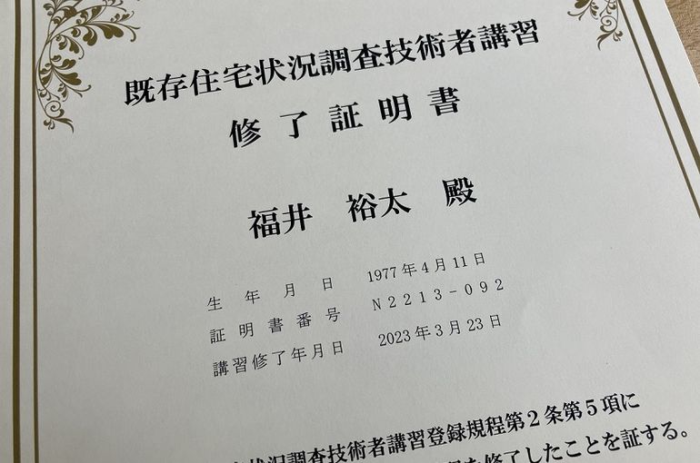 先日受講した「既存住宅状況調査技術者」の講習修了証明書が届きました。